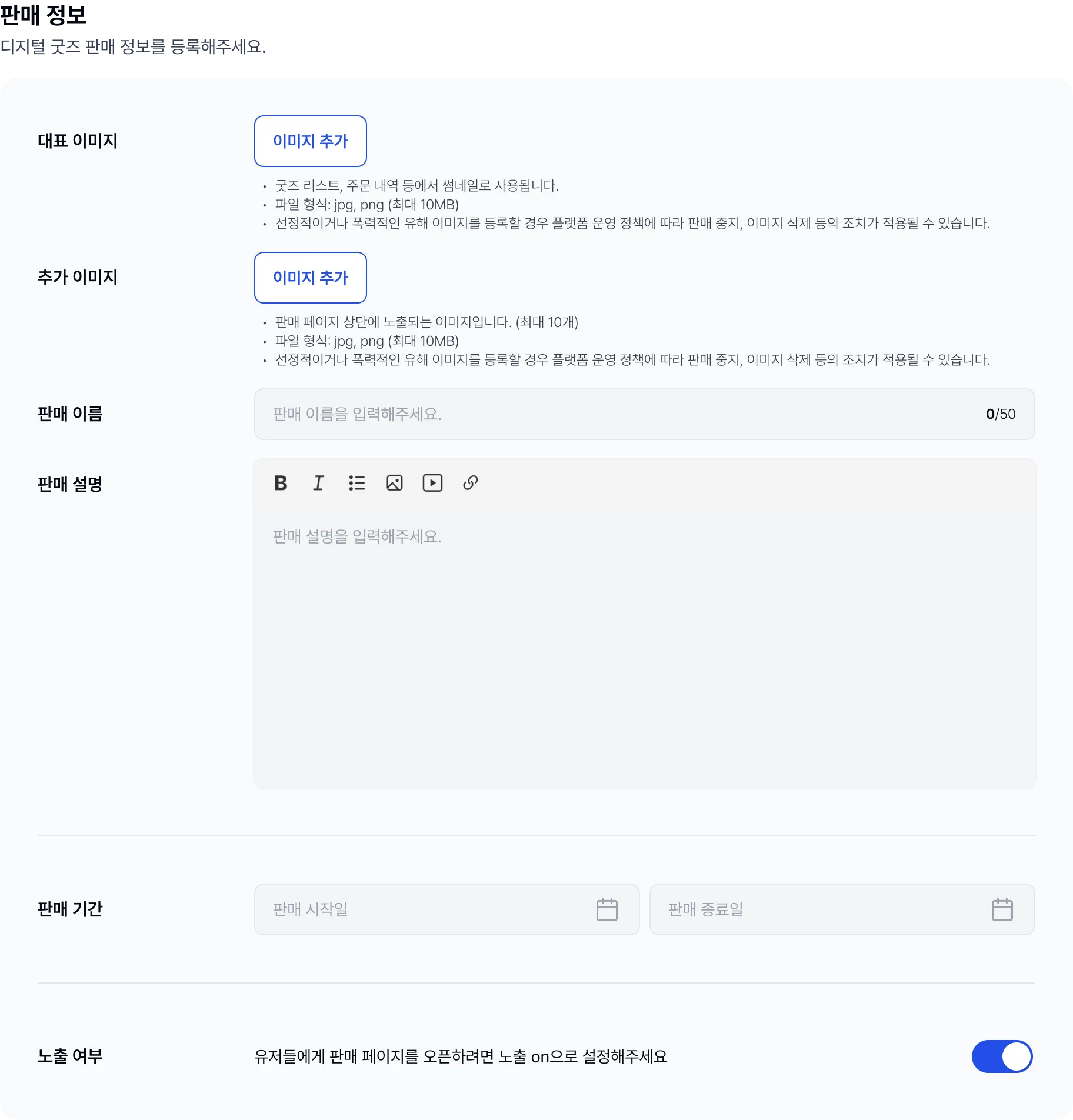 굿즈의 판매 시작일과 종료일을 설정합니다.